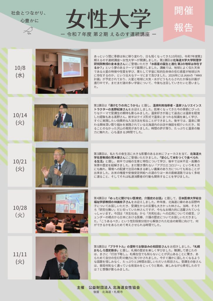 2026.01.05 【開催報告】令和7年度第2期えるのす連続講座~女性大学~ 令和7年度第2期えるのす連続講座~女性大学~は12月16日をもちまして終了いたしました。受講生の皆様、ありがとうございました! R7-2女性大学開催報告(PDF)